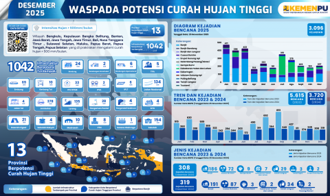 Waspada Potensi Banjir Bulan Desember 2025Desember 2025 Sebagai negara kepulauan beriklim tropis, Indonesia selalu dihadapkan pada risiko hidrometeorologis yang tidak ringan. Bencana hidrometeorologis disebabkan oleh faktor iklim melalui siklus air dan angin yang ada di permukaan bumi. Oleh karena itu, informasi cuaca sangat dibutuhkan untuk mengantisipasi bencana hidrometeorologis seperti banjir dan kekeringan. Berikut adalah informasi provinsi yang berpotensi banjir pada Bulan Desember 2025 beserta infrastruktur yang berada di provinsi tersebut. |