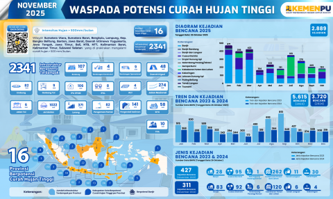 Waspada Potensi Banjir Bulan November 2025November 2025 Sebagai negara kepulauan beriklim tropis, Indonesia selalu dihadapkan pada risiko hidrometeorologis yang tidak ringan. Bencana hidrometeorologis disebabkan oleh faktor iklim melalui siklus air dan angin yang ada di permukaan bumi. Oleh karena itu, informasi cuaca sangat dibutuhkan untuk mengantisipasi bencana hidrometeorologis seperti banjir dan kekeringan. Berikut adalah informasi provinsi yang berpotensi banjir pada Bulan November 2025 beserta infrastruktur yang berada di provinsi tersebut. |