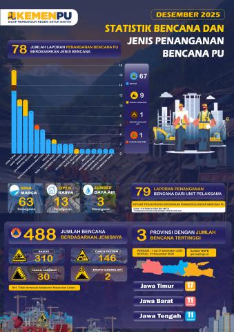 Penanganan Bencana Bulan Desember 2025Desember 2025 Pada Bulan Desember 2025 telah terjadi bencana di berbagai daerah di Indonesia. Kementerian PU ikut bertanggungjawab dalam penanganan dampak bencana antara lain menjaga konektivitas jaringan jalan dan jembatan, menyediakan fasilitas air bersih/air minum, sanitasi dan hunian sementara, relokasi korban terdampak dan berkoordinasi dengan pihak-pihak terkait untuk memastikan penanganan kerusakan infrastruktur PU. Berikut ini adalah Rekapitulasi Penanganan Bencana Bulan Desember 2025. |