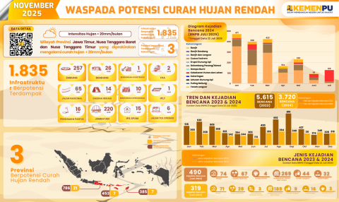 Waspada Potensi Kekeringan Bulan November 2025November 2025 Sebagai negara kepulauan beriklim tropis, Indonesia selalu dihadapkan pada risiko hidrometeorologis yang tidak ringan. Salah satunya yaitu bencana Kekeringan yaitu defisit curah hujan pada suatu wilayah dalam periode tertentu, yang dapat menyebabkan penurunan kelembaban tanah dan kerusakan tanaman. Oleh karena itu perlu waspada dalam penggunaan air untuk mengurangi risiko bencana Kekeringan. Berikut adalah informasi Provinsi yang berpotensi mengalami kekeringan pada Bulan November 2025 beserta infrastruktur yang mungkin terdampak pada provinsi tersebut. |
