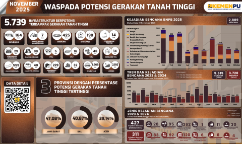 Waspada Potensi Gerakan Tanah Tinggi (Longsoran) Nasional Bulan November 2025November 2025 Prakiraan wilayah potensi terjadi gerakan tanah disusun berdasarkan hasil tumpang susun (overlay) antara peta zona kerentanan gerakan tanah dengan peta prakiraan curah hujan bulanan yang diperoleh dari ESDM. Oleh karenanya dibutuhkan informasi tersebut untuk mengantisipasi kondisi terburuk terhadap infrastruktur PU. Berikut adalah informasi infrastruktur terdampak yang berpotensi akibat gerakan tanah tinggi pada Bulan November 2025. |