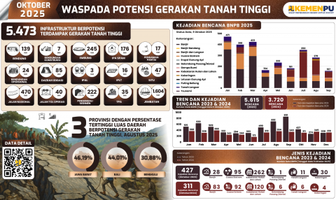 Waspada Potensi Gerakan Tanah Tinggi (Longsoran) Nasional Bulan Oktober 2025Oktober 2025 Prakiraan wilayah potensi terjadi gerakan tanah disusun berdasarkan hasil tumpang susun (overlay) antara peta zona kerentanan gerakan tanah dengan peta prakiraan curah hujan bulanan yang diperoleh dari ESDM. Oleh karenanya dibutuhkan informasi tersebut untuk mengantisipasi kondisi terburuk terhadap infrastruktur PU. Berikut adalah informasi infrastruktur terdampak yang berpotensi akibat gerakan tanah tinggi pada Bulan Oktober 2025. |