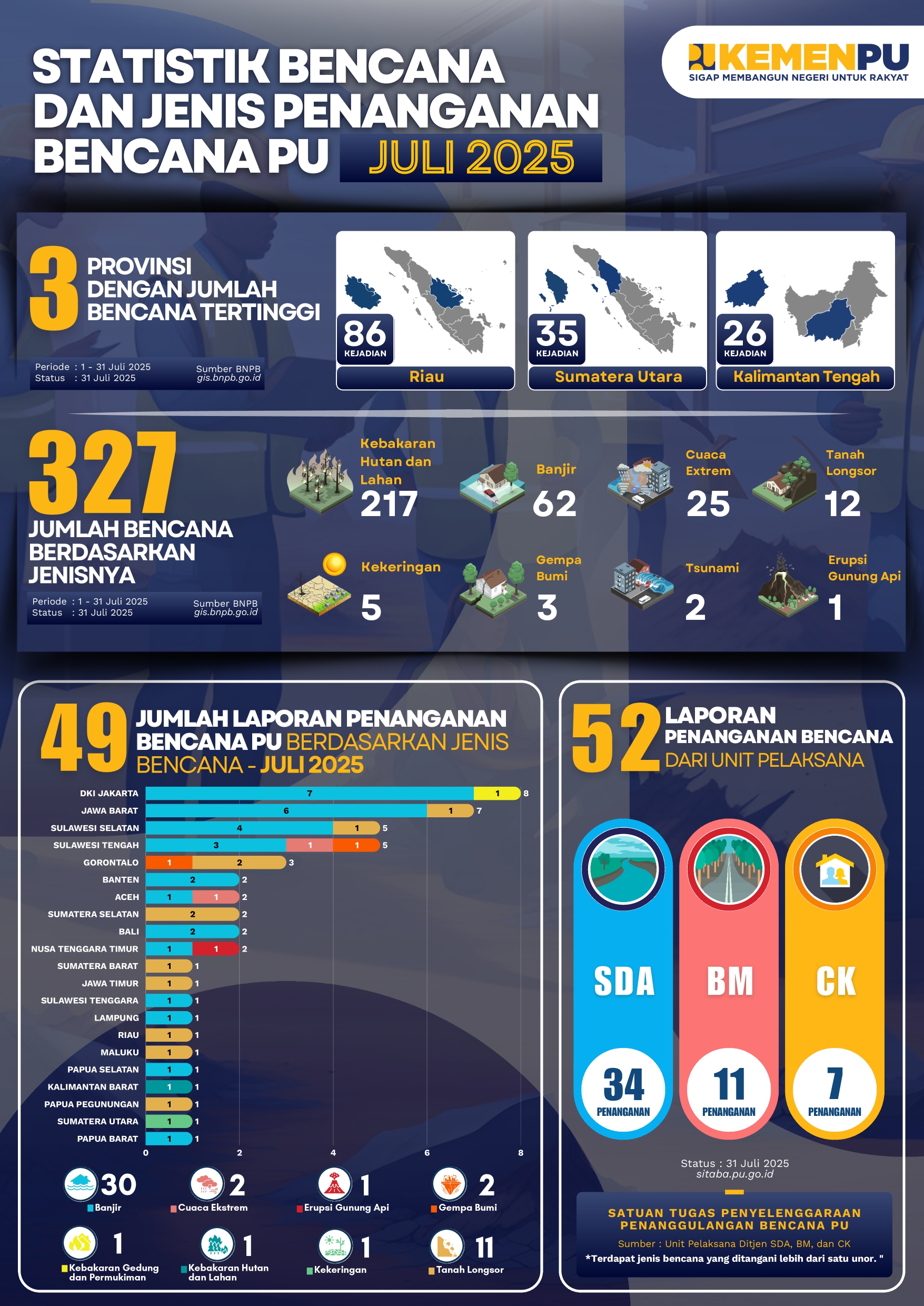 Pada Bulan Juli 2025 telah terjadi bencana di berbagai daerah di Indonesia. Kementerian PU ikut bertanggungjawab dalam penanganan dampak bencana antara lain menjaga konektivitas jaringan jalan dan jembatan, menyediakan fasilitas air bersih/air minum, sanitasi dan hunian sementara, relokasi korban terdampak dan berkoordinasi dengan pihak-pihak terkait untuk memastikan penanganan kerusakan infrastruktur PU. Berikut ini adalah Rekapitulasi Penanganan Bencana Bulan Juli 2025.