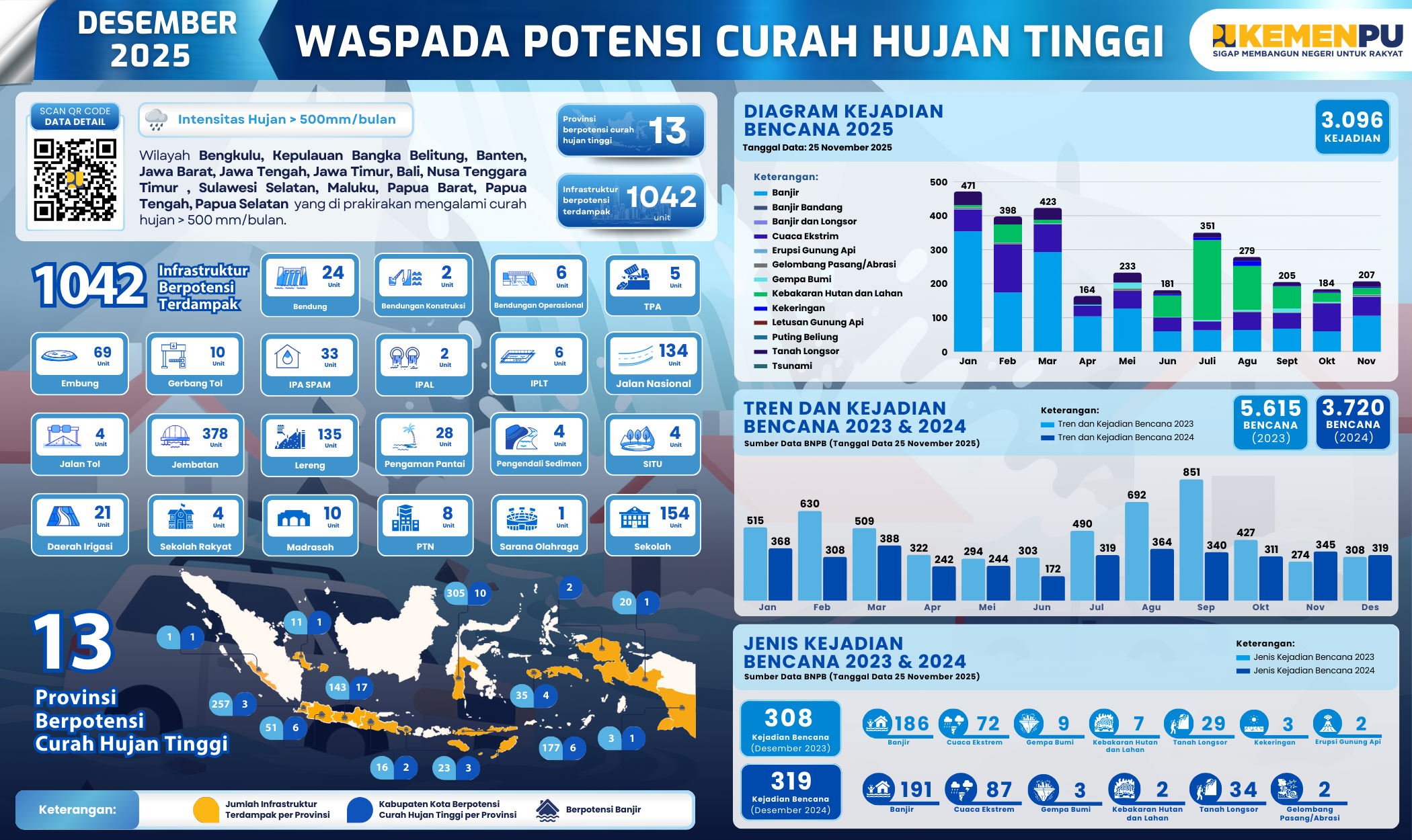 Sebagai negara kepulauan beriklim tropis, Indonesia selalu dihadapkan pada risiko hidrometeorologis yang tidak ringan. Bencana hidrometeorologis disebabkan oleh faktor iklim melalui siklus air dan angin yang ada di permukaan bumi. Oleh karena itu, informasi cuaca sangat dibutuhkan untuk mengantisipasi bencana hidrometeorologis seperti banjir dan kekeringan. Berikut adalah informasi provinsi yang berpotensi banjir pada Bulan Desember 2025 beserta infrastruktur yang berada di provinsi tersebut.