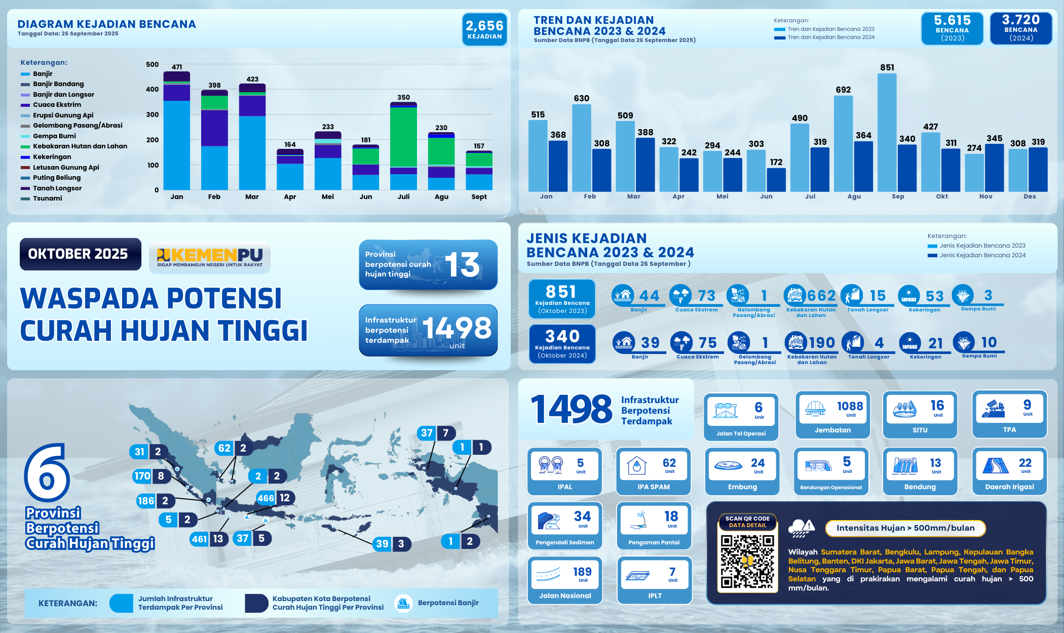 Sebagai negara kepulauan beriklim tropis, Indonesia selalu dihadapkan pada risiko hidrometeorologis yang tidak ringan. Bencana hidrometeorologis disebabkan oleh faktor iklim melalui siklus air dan angin yang ada di permukaan bumi. Oleh karena itu, informasi cuaca sangat dibutuhkan untuk mengantisipasi bencana hidrometeorologis seperti banjir dan kekeringan. Berikut adalah informasi provinsi yang berpotensi banjir pada Bulan Oktober 2025 beserta infrastruktur yang berada di provinsi tersebut.