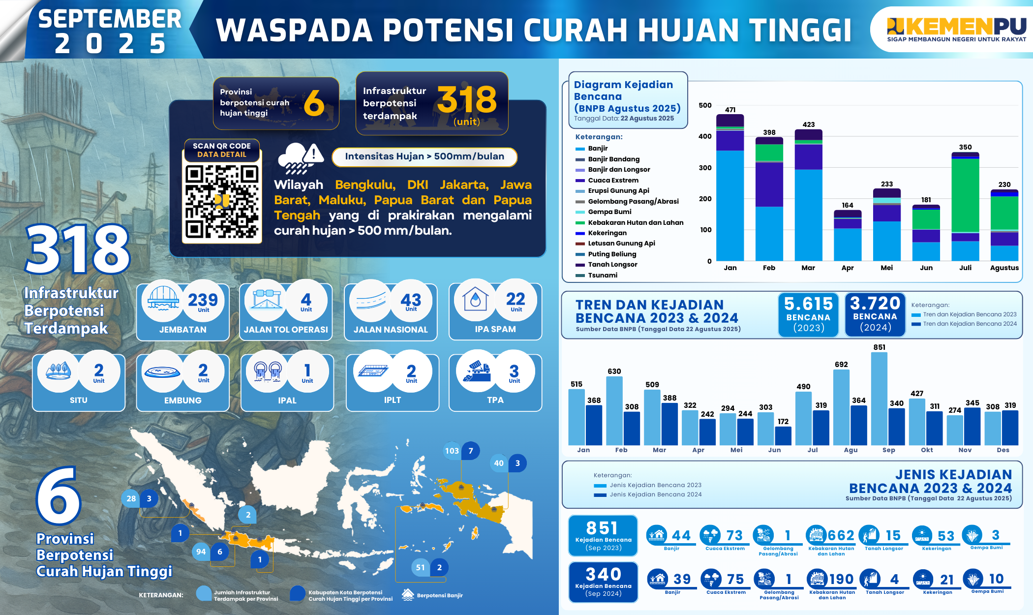 Sebagai negara kepulauan beriklim tropis, Indonesia selalu dihadapkan pada risiko hidrometeorologis yang tidak ringan. Bencana hidrometeorologis disebabkan oleh faktor iklim melalui siklus air dan angin yang ada di permukaan bumi. Oleh karena itu, informasi cuaca sangat dibutuhkan untuk mengantisipasi bencana hidrometeorologis seperti banjir dan kekeringan. Berikut adalah informasi provinsi yang berpotensi banjir pada Bulan September 2025 beserta infrastruktur yang berada di provinsi tersebut.