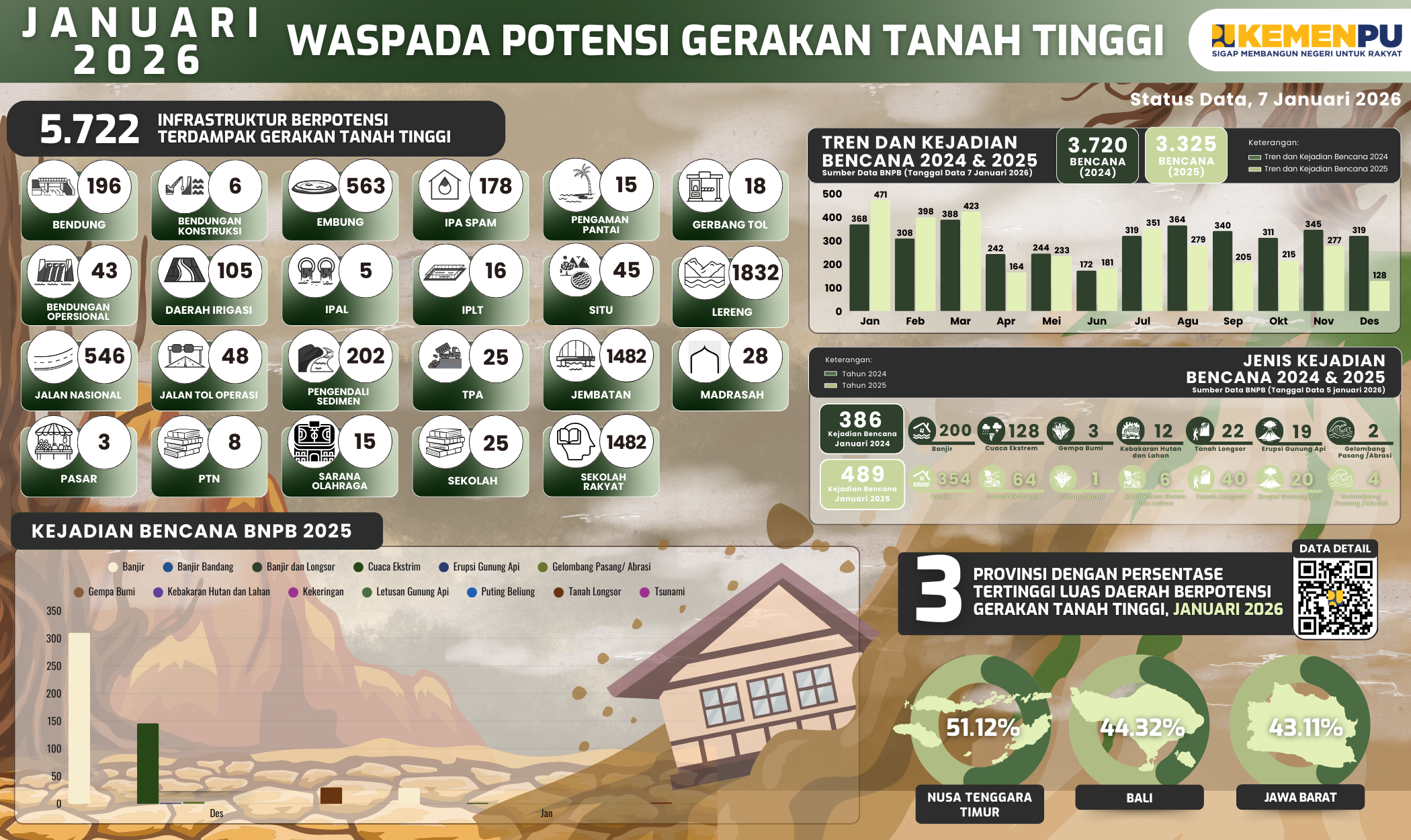 Prakiraan wilayah potensi terjadi gerakan tanah disusun berdasarkan hasil tumpang susun (overlay) antara peta zona kerentanan gerakan tanah dengan peta prakiraan curah hujan bulanan yang diperoleh dari ESDM. Oleh karenanya dibutuhkan informasi tersebut untuk mengantisipasi kondisi terburuk terhadap infrastruktur PU. Berikut adalah informasi infrastruktur terdampak yang berpotensi akibat gerakan tanah tinggi pada Bulan Januari 2026.