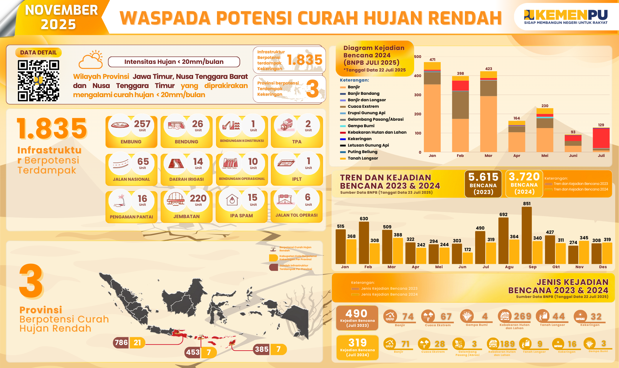 Sebagai negara kepulauan beriklim tropis, Indonesia selalu dihadapkan pada risiko hidrometeorologis yang tidak ringan. Salah satunya yaitu bencana Kekeringan yaitu defisit curah hujan pada suatu wilayah dalam periode tertentu, yang dapat menyebabkan penurunan kelembaban tanah dan kerusakan tanaman. Oleh karena itu perlu waspada dalam penggunaan air untuk mengurangi risiko bencana Kekeringan. Berikut adalah informasi Provinsi yang berpotensi mengalami kekeringan pada Bulan November 2025 beserta infrastruktur yang mungkin terdampak pada provinsi tersebut.